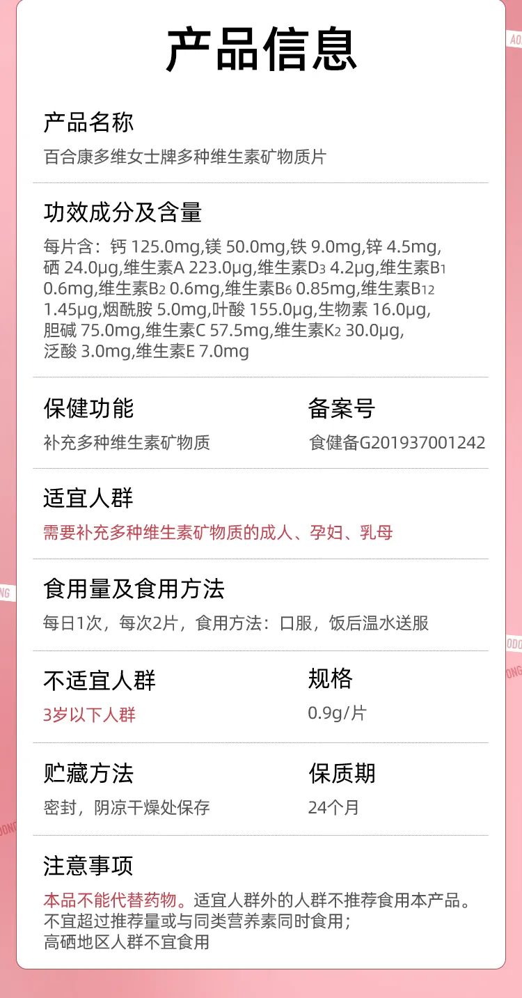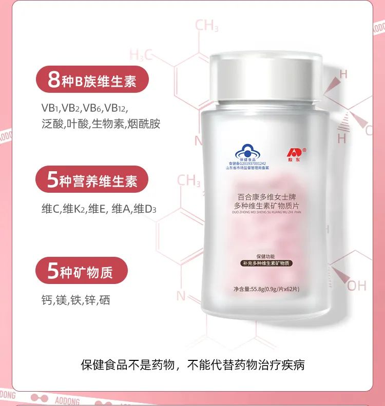 這款賣爆了的多種維生素產(chǎn)品,是百合股份與吉林敖東健康科技有限公司合作推出的一款網(wǎng)紅單品——百合康多維女士牌多種維生素礦物質(zhì)片。是專門針對(duì)女性人群設(shè)計(jì)的一款維生素礦物質(zhì)膳食補(bǔ)充劑。