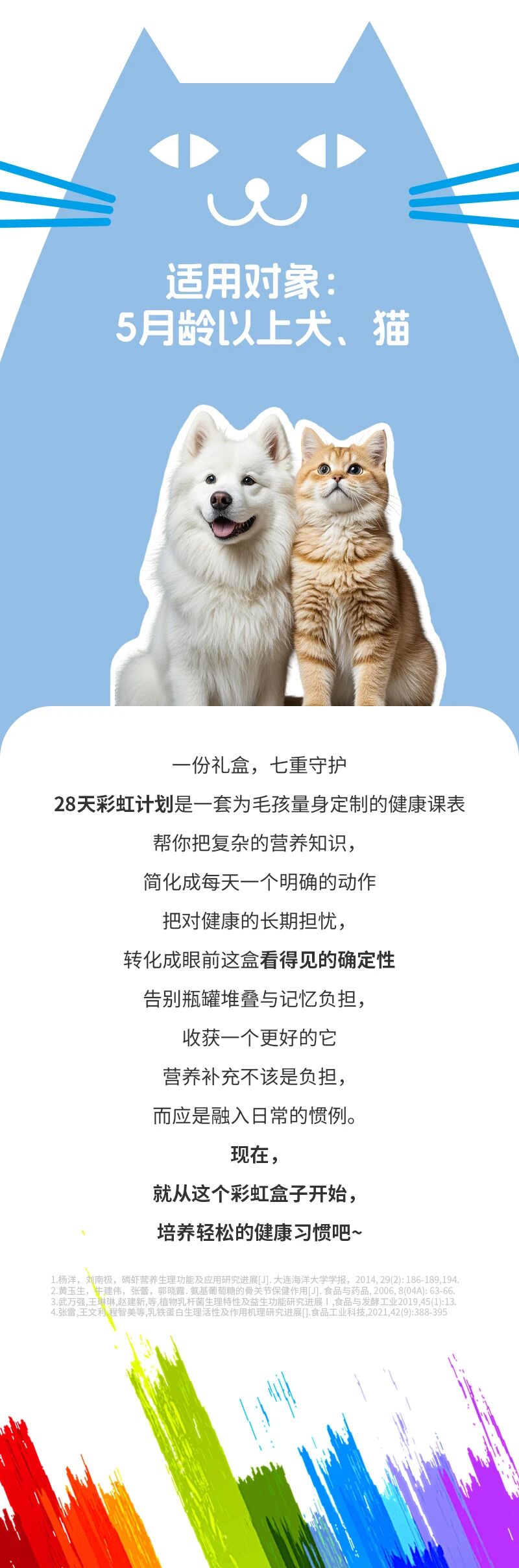 樹(shù)上的叮當(dāng)球和星星里 好像有什么特別的東西…… 華寵生物28天彩虹計(jì)劃營(yíng)養(yǎng)盒 將寵物核心健康維度凝聚成7種天然色彩 搭配7種專(zhuān)研配方 用4周28天完整周期 為愛(ài)寵提供多巴胺彩虹營(yíng)養(yǎng)補(bǔ)給