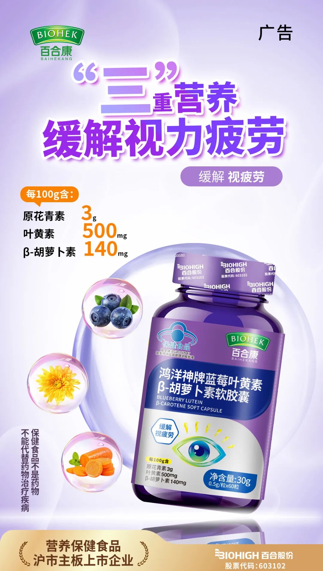 百合康牌藍(lán)莓葉黃素β-胡蘿卜素軟膠囊則聚焦眼部健康,優(yōu)質(zhì)野生藍(lán)莓萃取,每100g含原花青素3g、葉黃素500mg、β-胡蘿卜素140mg,具備扎實(shí)的科學(xué)配方基礎(chǔ)。覆蓋從青少年到都市白領(lǐng)再到中老年等多類需求人群,緩解視覺疲勞。